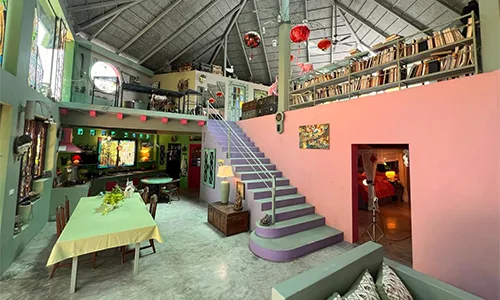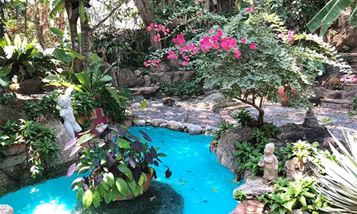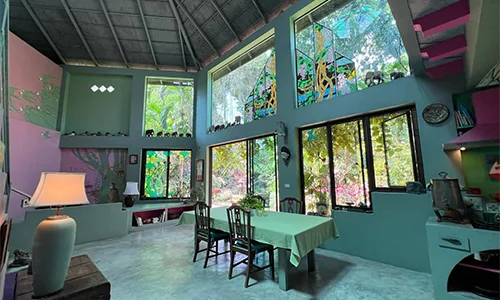 There is a garden, quiet and peaceful, a maid for 2 hours and a gardener once a week. The owner is an art teacher The house is 5 minutes from Rawai, Promthep Cape, Nai Harn, Yanui 7 minutes